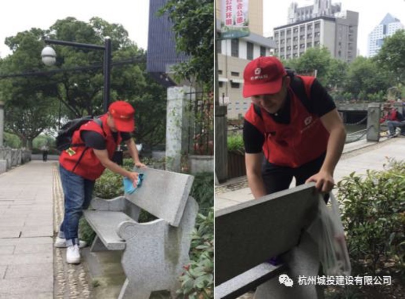 在昌化新村河岸公园里,志愿者们一边清洁这些石凳,一边捡拾着花草丛中的杂物,还沿河景观一份清新亮丽。
