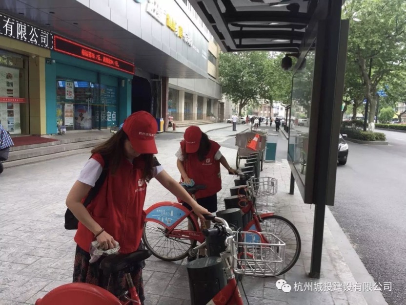 在武林广场公共自行车租赁点,青年志愿者们手提水桶、拿着抹布,细心擦拭着小红车,为借车市民清爽出行贡献自己的绵薄之力。