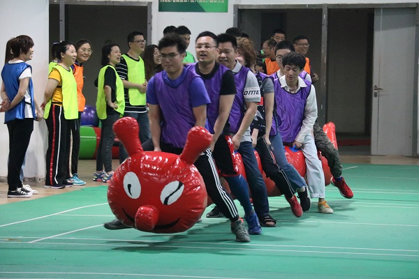 猛一看,这项目名称挺可爱,其实就是每支队伍骑着充气毛毛虫在赛道上前行到达终点,要每一个成员都通过终点才算完成,比赛用时长短进行排名,获得相应积分。这其实是个充分考验协调性的问题,每个成员高矮不同,步伐不一,需要在短时间的练习中把大家的步子协调统一到一个相对适合的速度和频率,然后稳步前行,才可能用时快又稳当,如果一个人拼命快步走,势必会有人摔跤。就像在团队任务达成时,需要彼此帮扶、包容和适应,在工作中,个人要服从团队,拧成一股绳,劲往一处使,则无往不利、无坚不摧。